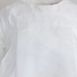 Cremeweißes Taufkleid von Oli Prik aus seidenähnlichem Cremeweiß-Stoff mit langen Ärmeln. Drei Schichten mit Mittelfutter aus Polyester und Innenfutter aus Baumwolle.